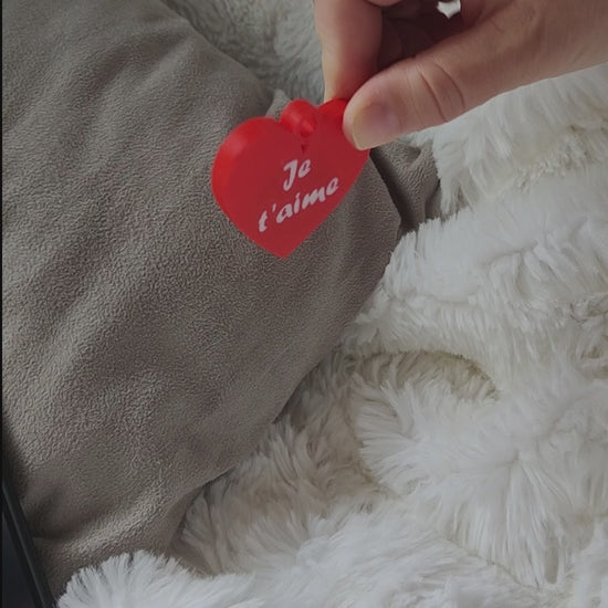- Forme : Cœur rouge avec texte blanc "Je t'aime".
