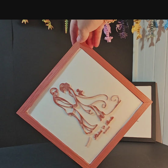 Le cadre “Rose” capture la douceur et la complicité des mariés à travers un dessin filaire imprimé en 3D sur tissu.